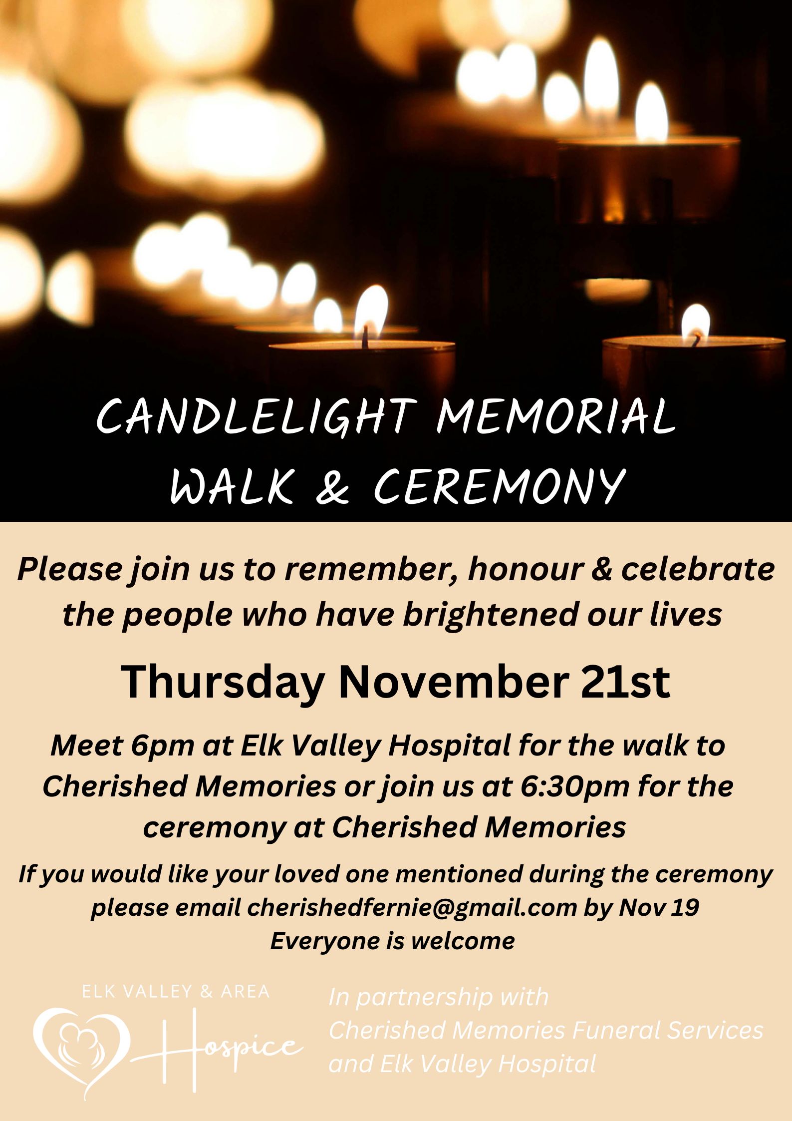 Candlelight Memorial Walk & Ceremony – Thursday November 21st Cherished Memories Funeral Services, Elk Valley Hospital and Elk Valley & Area Hospice invites you to…