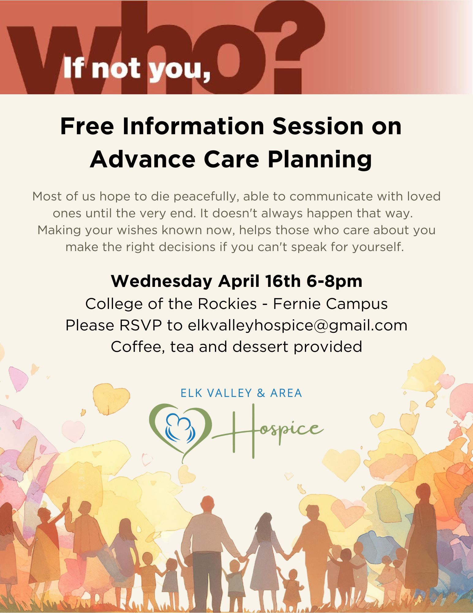 Feel free to contact us anytime! By phone 250 423 4453 ext. 38109 or email elkvalleyhospice@gmail.com