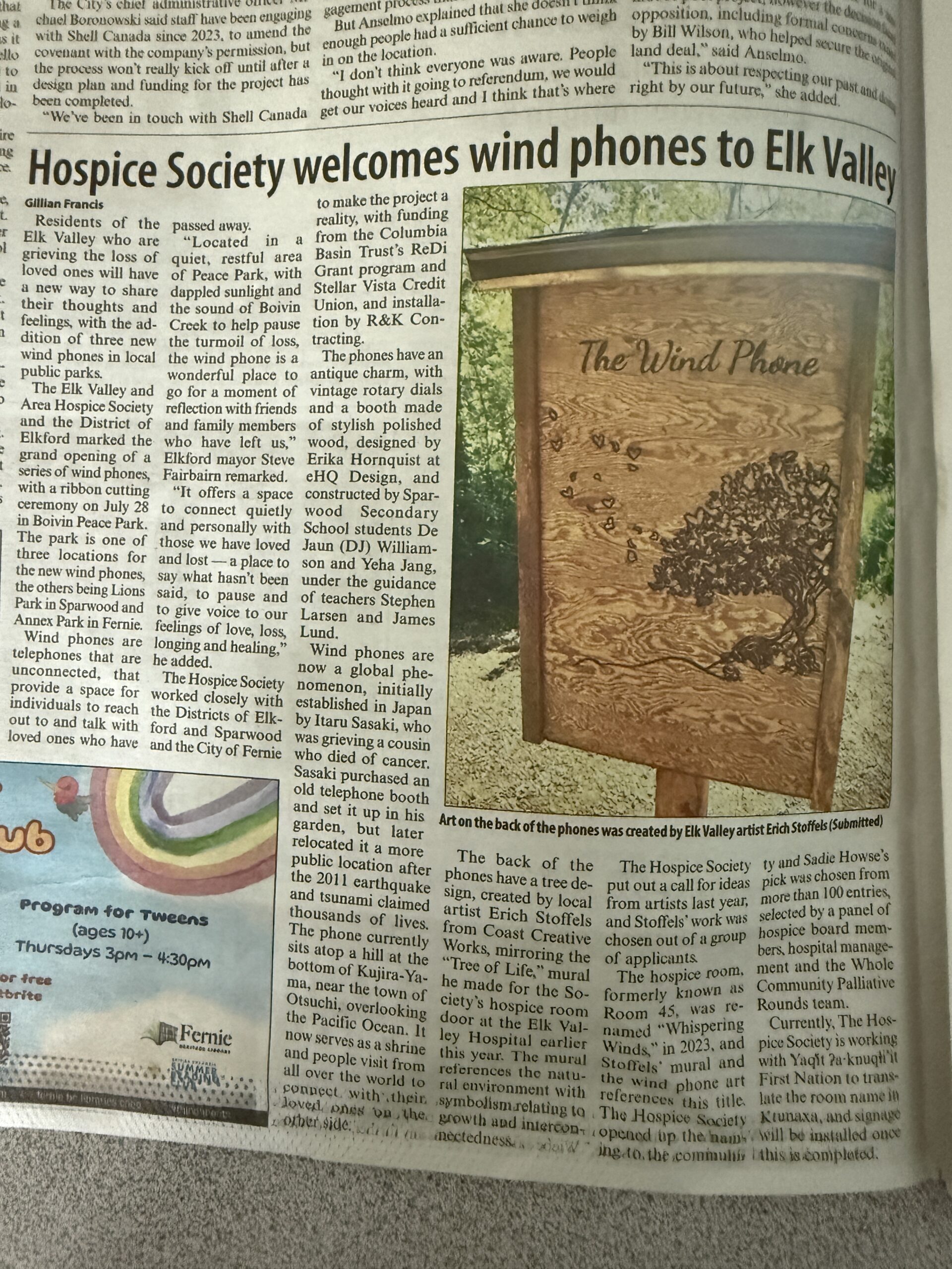 At Elk Valley & Area Hospice, we understand that grief doesn’t follow a schedule — and that sometimes, healing begins with simply saying the words we didn’t get to say. Our Wind Phones offer a quiet, reflective space where anyone can pick up the receiver and speak to those they’ve lost. There’s no connection, no dial tone — just a symbolic line between the heart and the memories that live on.